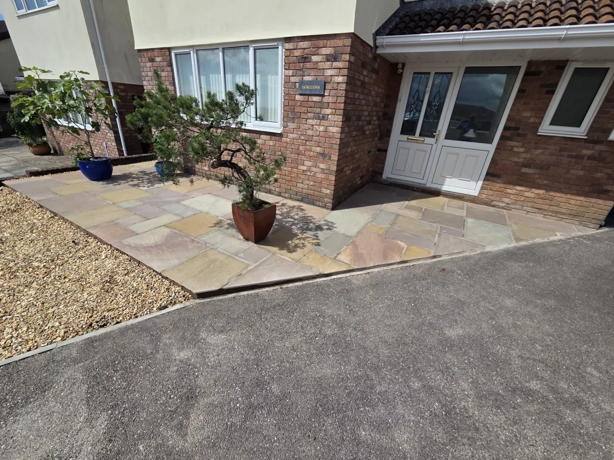 This front entrance project replaced a tired, demolished frontage with a striking Indian stone patio and decorative gravel driveway. The design balances hard landscaping with soft planting, featuring a specimen bonsai tree as a focal point.